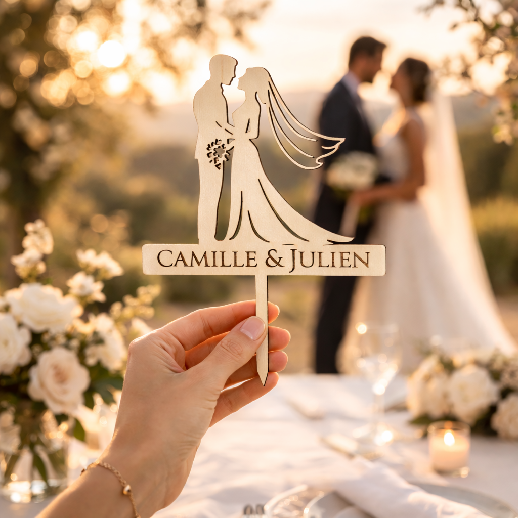 Ajoutez une note d’élégance et de poésie à votre dessert avec ce cake topper mariés personnalisé en bois.