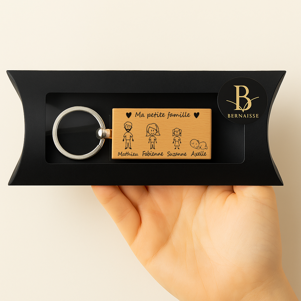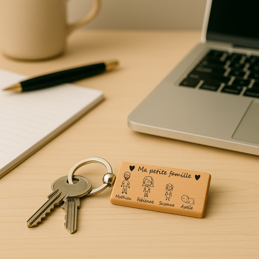 Ce porte-clé famille personnalisé en bois est le détail touchant qui accompagne chaque instant de la journée.